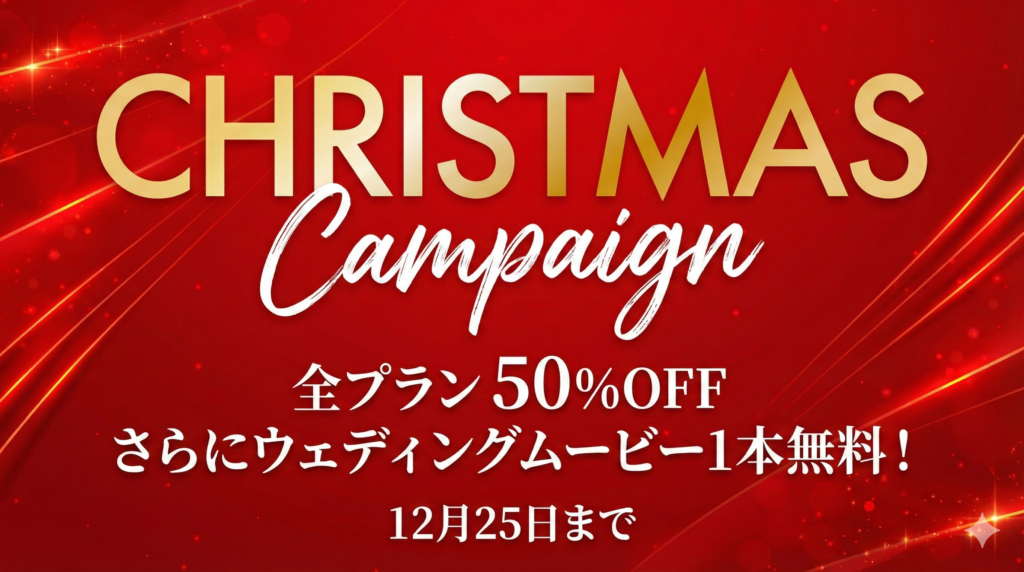 各プラン50%OFF+ウェディングムービー無料でご提供いたします。