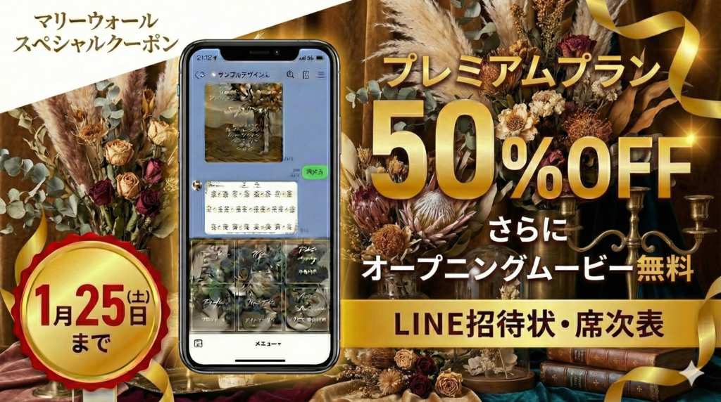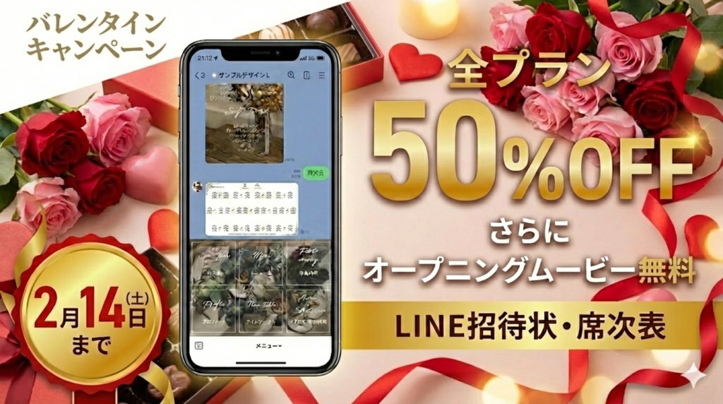 全プラン50%OFF+ウェディングムービー無料でご提供いたします。