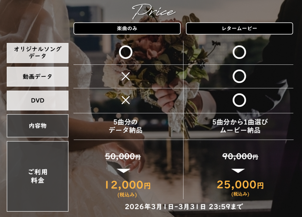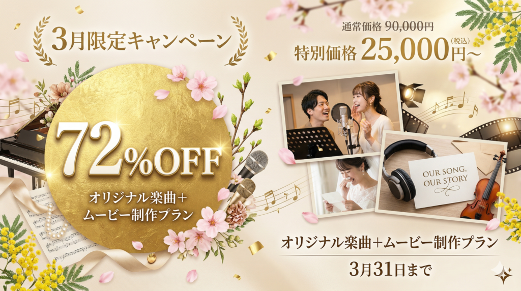 担当の方がとても丁寧にヒアリングしてくださり、思い描いていた以上の仕上がりでした。会場の友人からも『歌に感情が乗っていて感動した』とたくさん声をかけてもらい、結婚式の思い出がさらに深まりました。